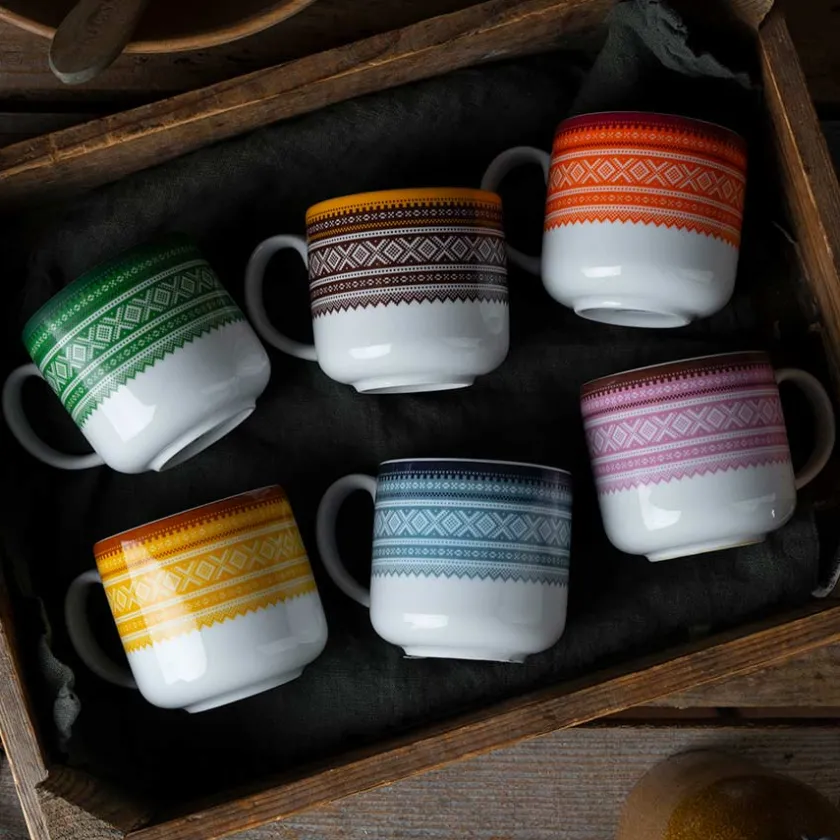 En pakke med 6 stk flerfarget krus fra Marius og Porsgrunds Porselænsfabrik. Det tradisjonsrike Mariusmønsteret har siden 1953 prydet både klesplagg og serviser, og igjennom tiden fått sin plass som et norsk designikon. I denne pakken får du 6 stk krus i ulike farger som sammen skaper en vakker fargepalett på bordet, perfekt til både hjemmet og hytta.