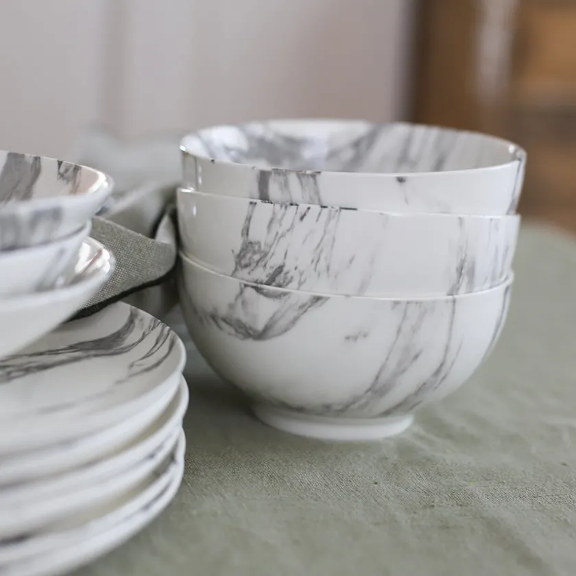 Bolle fra Porsgrunds Porselænsfabriks servise Marmor. Bollen på 14cm er ideell til frokostblanding, yoghurt, små salater eller snacks. Med sitt elegante marmormønster blir den et dekorativt element på bordet, samtidig som den er svært praktisk i bruk.