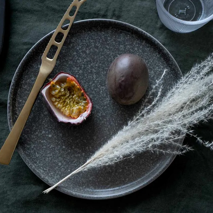 Tallerken 25 cm med kant i mørk granitt fra Porsgrunds Porselænsfabrik i serien Natur. Serien Natur er designet i en nordisk stil og kommer i organiske former og farger. Hovedtanken bak serien er å bringe naturen inn på spisebordet. Serviset i porselen er inspirert av det matte fra fjellet, og serviset i glass er inspirert av det blanke fra vannet. Tallerkenen i mørk granitt kan brukes alene, eller kombineres med de andre fargene eller serviset i glass for et personlig og unikt preg.