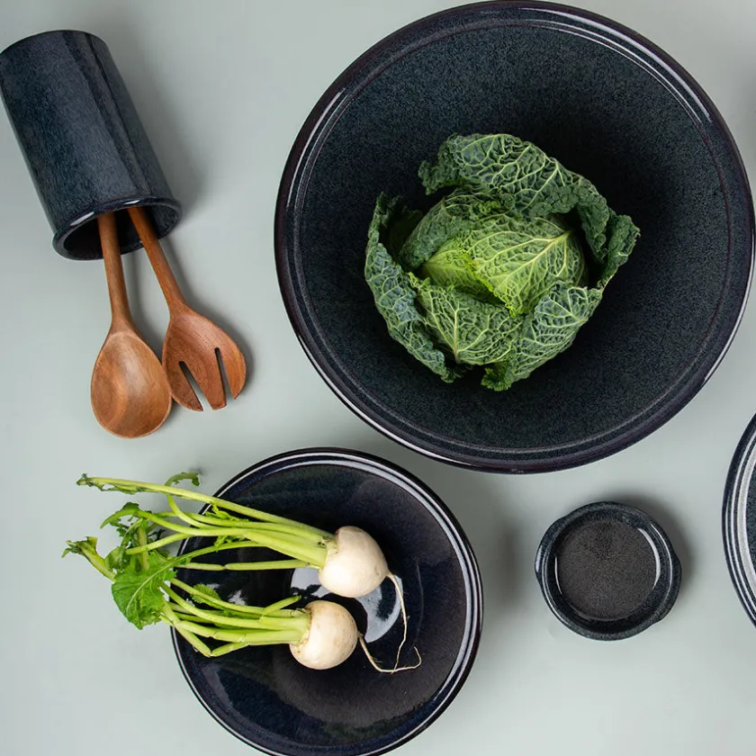 Den mørke, matte Noche-glassuren gir en elegant kontrast på kjøkkenbenken, samtidig som den robuste konstruksjonen sørger for stabilitet. Med sin ildfaste egenskap kan den også brukes til å holde varme redskaper etter bruk.