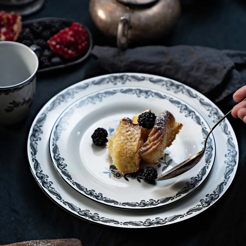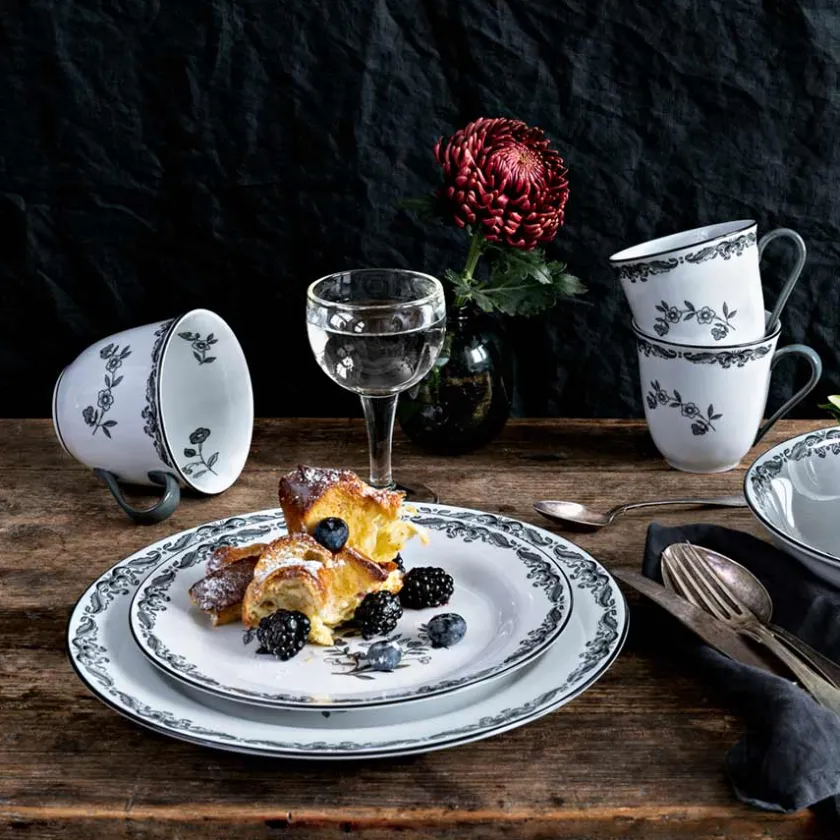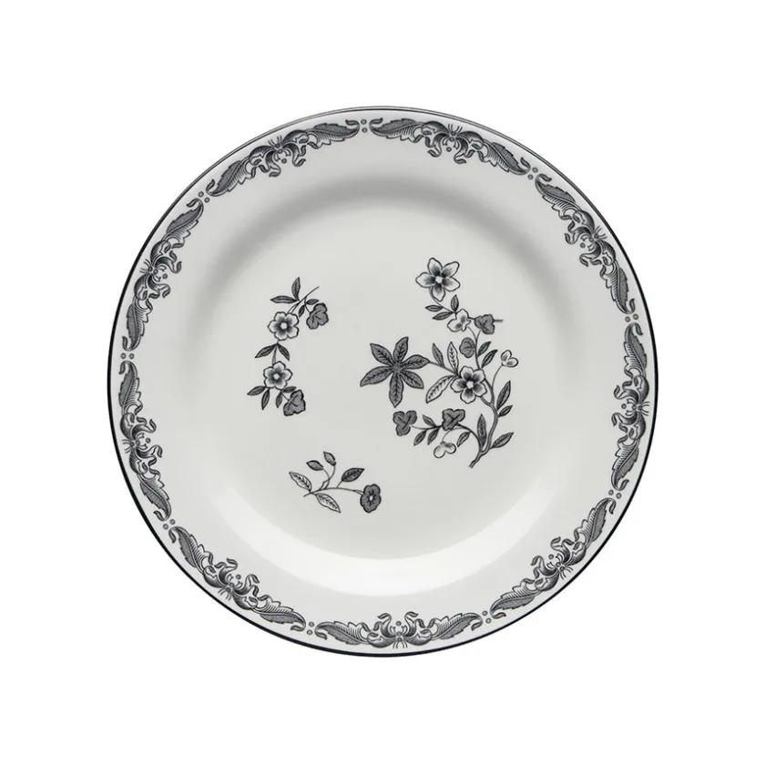 Frokosttallerken fra Rørstrands flotte servise Ostindia Svart. Serviset med de sorte detaljene er basert på det originale Ostindia-serviset som først så dagens lys i 1932. Det nye serviset med sort blomstermotiv er et elegant og klassisk tilskudd på middagsbordet som flere generasjoner vil sette pris på.