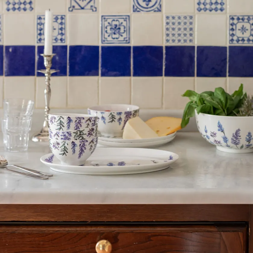 Bolle på 11,5 cm fra serviset Provence og Christiania 1739. Dekoren på serviset er hentet fra velduftende lavendelenger fra nettopp Provence, som skaper en nydelig ramme rundt måltidet. Kombinasjonen av det hvite porselenet og blomstenes delikate fargetoner gjør serviset velegnet i de ulike sammensetninger, store og små.