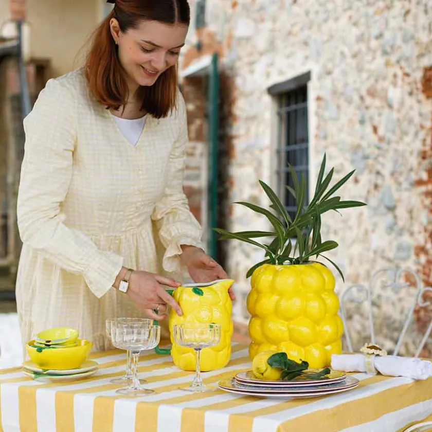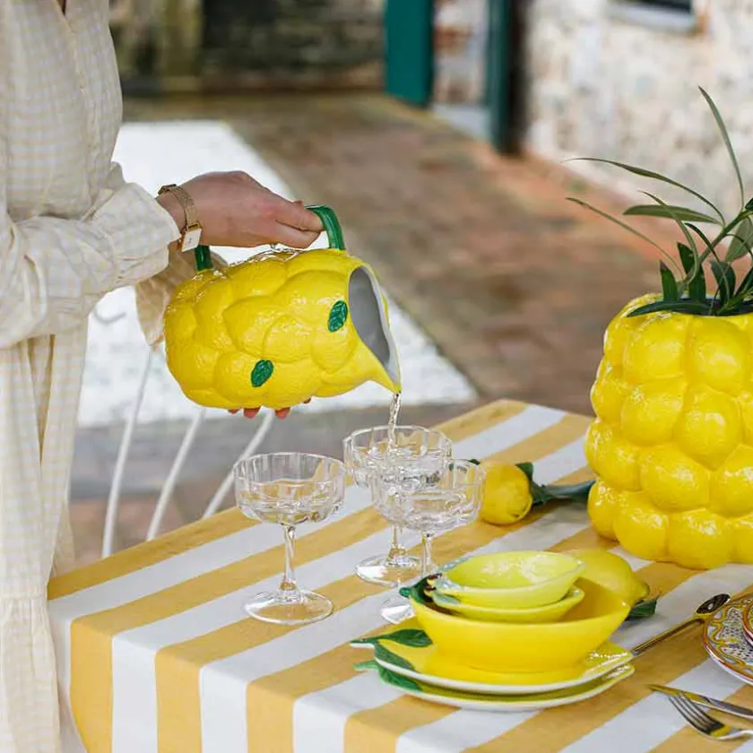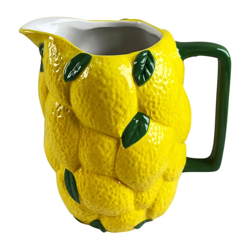 Gjør serveringen enda mer innbydende med denne fargerike keramikkmuggen fra Capri Collection. Med en kapasitet på 2 liter er den ideell for å servere forfriskende drikker som lemonade, iste eller vann med sitron og mynte. Muggen har et unikt sitronmønster med en taktil, glassert overflate som gir et håndlaget preg. Den grønne hanken gir et solid grep, og den presise helletuten gjør det enkelt å skjenke uten søl.Plasser den på et sommerlig dekket bord eller bruk den som en dekorativ vase for blomster. Denne muggen er en perfekt blanding av funksjonalitet og estetikk, og den tåler oppvaskmaskin for enkel rengjøring.Skap en varm og innbydende stemning på kjøkkenet eller i hagen med denne livlige sitronmuggen. Enten du dekker til en sommerfest eller nyter en rolig stund på terrassen, er denne muggen det perfekte valget for deg som elsker fargerik og funksjonell keramikk.