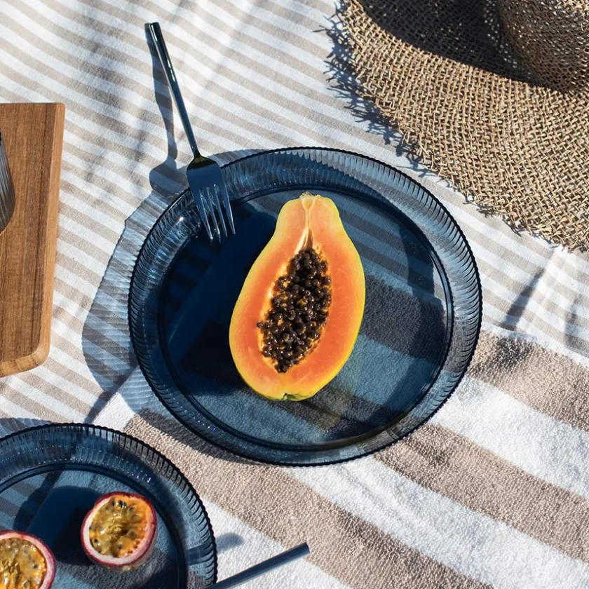 Tallerken med riller på 25cm i fargen marine er en solid og vakker middagstallerken i dyp marineblå akryl, designet for å tåle sommerens eventyr. Med sin store størrelse og slitesterke kvalitet er den ideell for hovedretter, grillmat, salater og mer.Det rillete designet gir tallerkenen en eksklusiv følelse samtidig som det sørger for godt grep – perfekt når måltidet nytes utendørs. Den dype blåfargen gir en maritim stemning og passer perfekt til sommerens avslappede, men stilfulle borddekking.Tallerkenen tåler oppvaskmaskin, men for å bevare fargen og glansen anbefales det å vaske den for hånd innimellom. Matcher perfekt med andre produkter fra Riller-serien for en helhetlig sommeropplevelse. Et elegant valg for alle som elsker å spise ute i sommersolen!