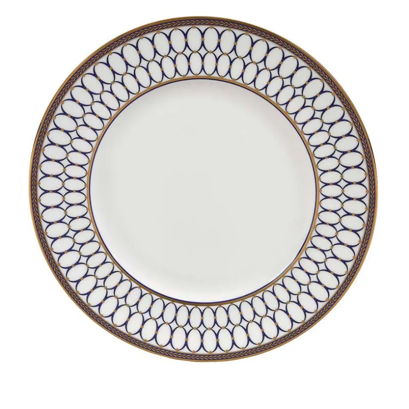 Tallerken i 27 cm fra Wedgwood i serien Renaissance Gold. Det flotte serviset Renaissance Gold kombinerer autentisitet samtidig som det opprettholder en moderne og klassisk stil. Den elegante tallerkenen i benporselen er dekorert i et stilfullt design av rene ovale former i blå, og omkranset med vakre gullbånd for det lille ekstra preget. Tallerkenen kan vaskes i oppvaskmaskin.