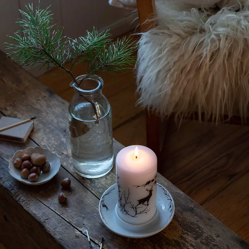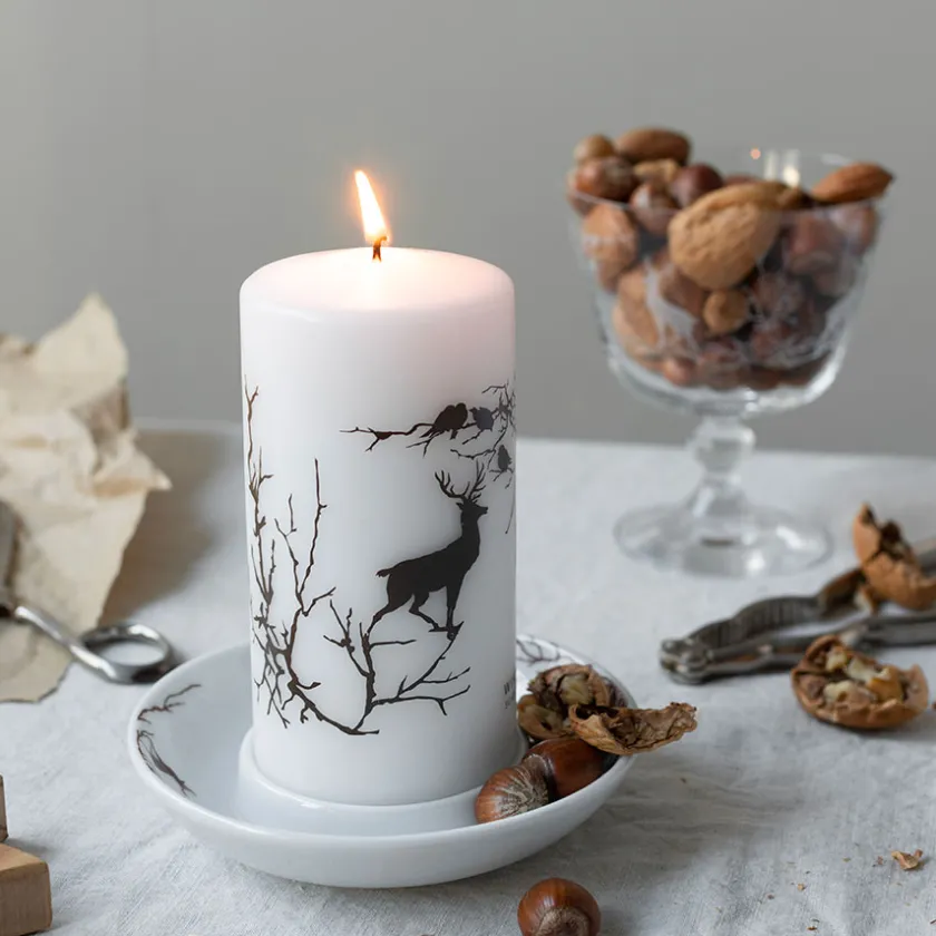 Kubbelys på 14 cm x 7 cm fra Wik & Walsøes eventyrlige serie Alveskog. Kubbelyset er dekket av dekorative elementer av den majestetiske hjorten, som omringes av bare grener.